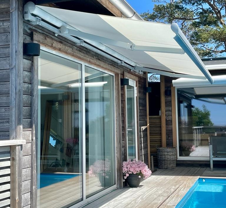 Genom att byta väv istället för hela markisen kan du ge huset ett helt nytt uttryck – samtidigt som du förlänger livslängden på din markis.